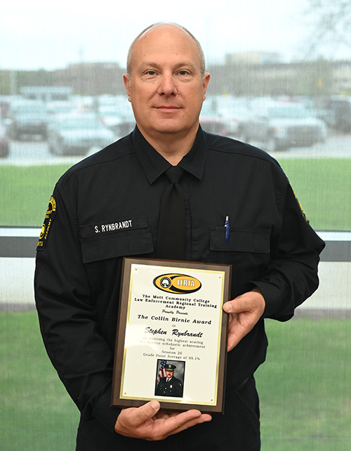Rynbrandt is thankful for the Collin Birnie Scholarship Award he received during the Mott Community College police academy graduation May 1, 2025. He completed the academy with a 95.1 GPA and was selected from among three pre-service cadets for the Collin Birnie Award in the 26th Academy Session with a graduating class of 25 cadets.